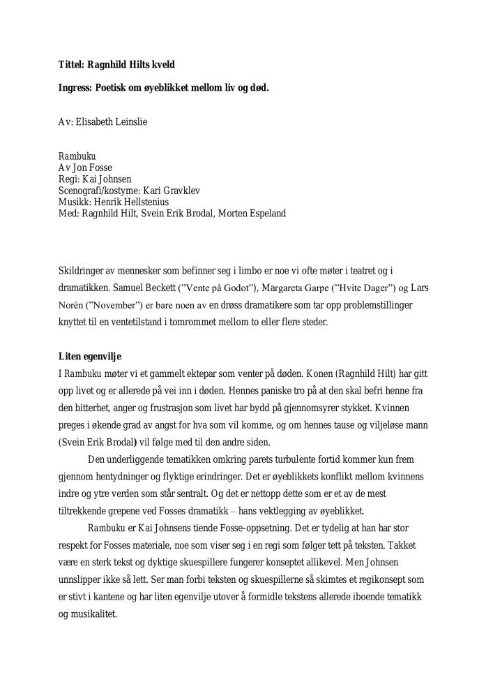 Ragnhild Hilts kveld. Anmeldelse av Det Norske Teatrets produksjon Rambuku (2006). Anmeldelsen ble publisert i Dagsavisen 4. februar 2006.