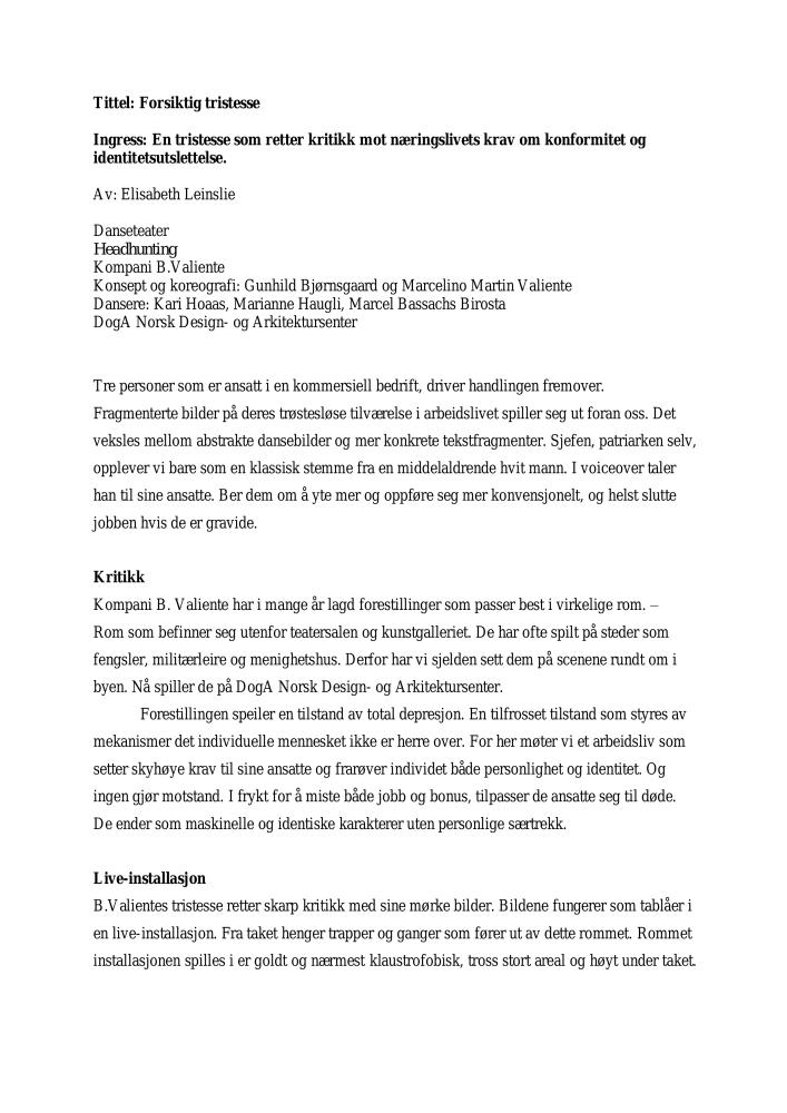 Forsiktig tristesse. Anmeldelse av Kompani B. Valientes produksjon Headhunting (2006). Anmeldelsen ble publisert i Dagsavisen i 2006.