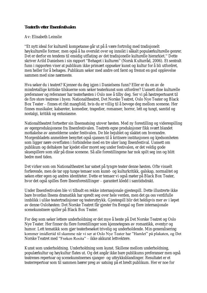 Teaterlivet etter Ibsenfestivalen. Kommentar om teaterrepertoaret i Oslo høsten 2006. Kommentaren ble publisert i Dagsavisen i september 2006.
