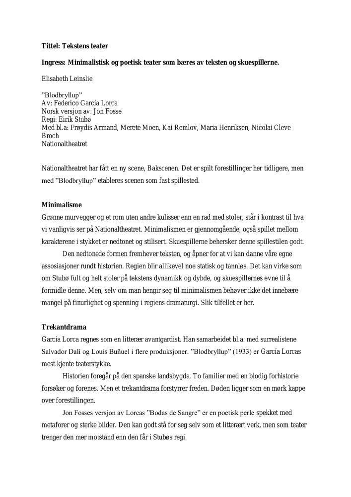 Tekstens teater. Anmeldelse av Nationaltheatrets produksjon Blodbryllup (2006). Anmeldelsen ble publisert i Dagsavisen 2. april 2006.
