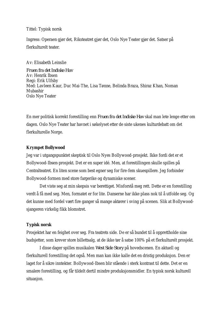 Typisk norsk. Anmeldelse av Oslo Nye Teaters produksjon Bollywood Ibsen: Fruen fra Det indiske hav (2006). Anmeldelsen ble publisert i Dagsavisen 26. mars 2006.