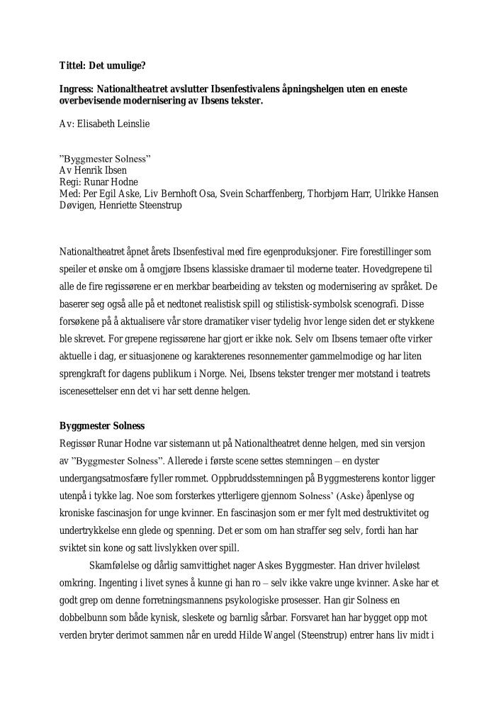 Det umulige?. Anmeldelse av Nationaltheatrets produksjon Byggmester Solness (2006). Anmeldelsen ble publisert i Dagsavisen 28. august 2006.