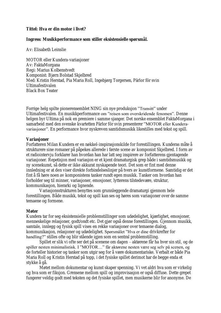 Hva er din motor i livet?. Anmeldelse av FaktaMorganas produksjon MOTOR eller Kundera-variasjoner (2006). Anmeldelsen ble publisert i Dagsavisen 7. oktober 2006.