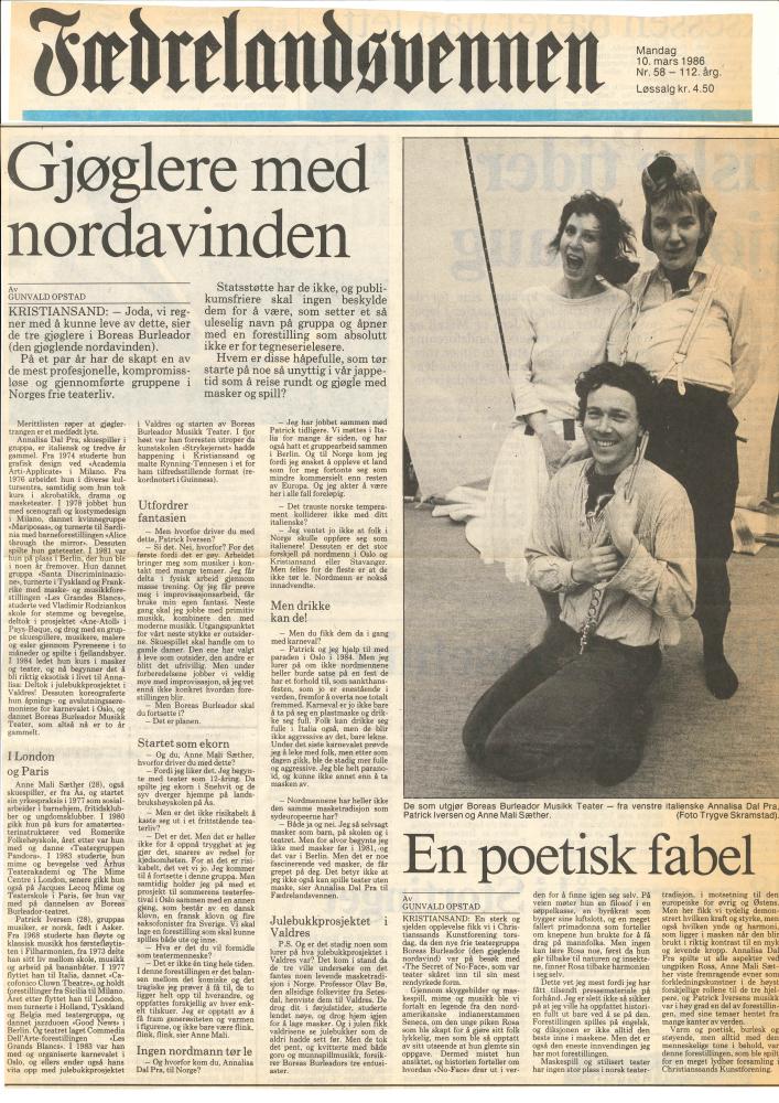 Anmeldelsen og Intervju ble publisert i Fædrelandsvennen 10.03.1986.