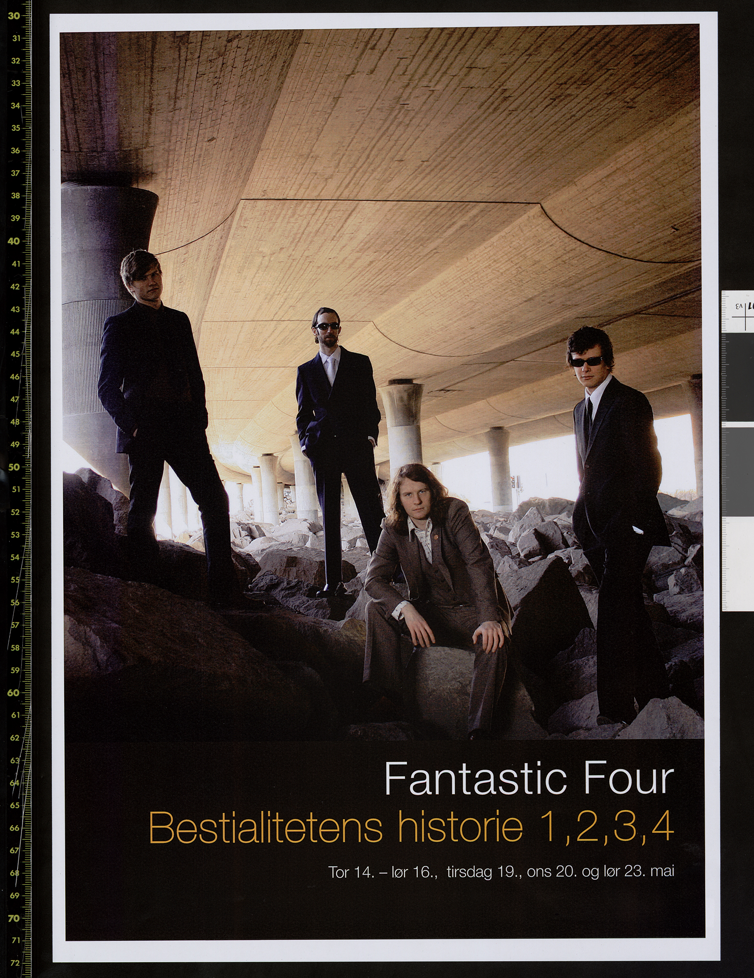 Plakat for Fantastic Fours produksjon Bestialitetens historie 1, 2, 3, og 4 (2007). Plakaten er fra forestillingene på Black Box Teater i Oslo i mai 2009.