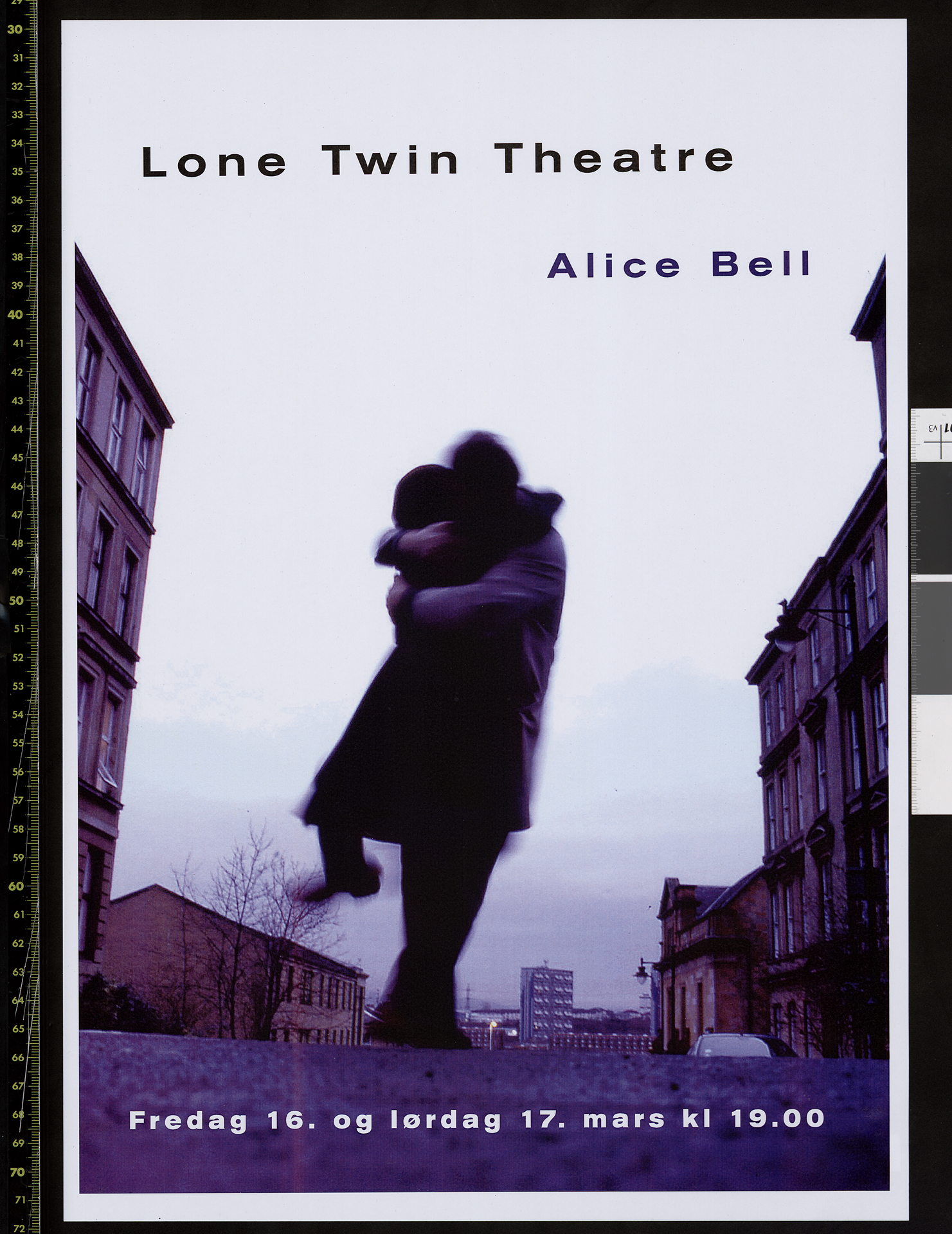 Plakat for Lone Twin Theatres produksjon Alice Bell (2006). Plakaten er fra forestillngene på Black Box Teater i Oslo i mars 2007.
