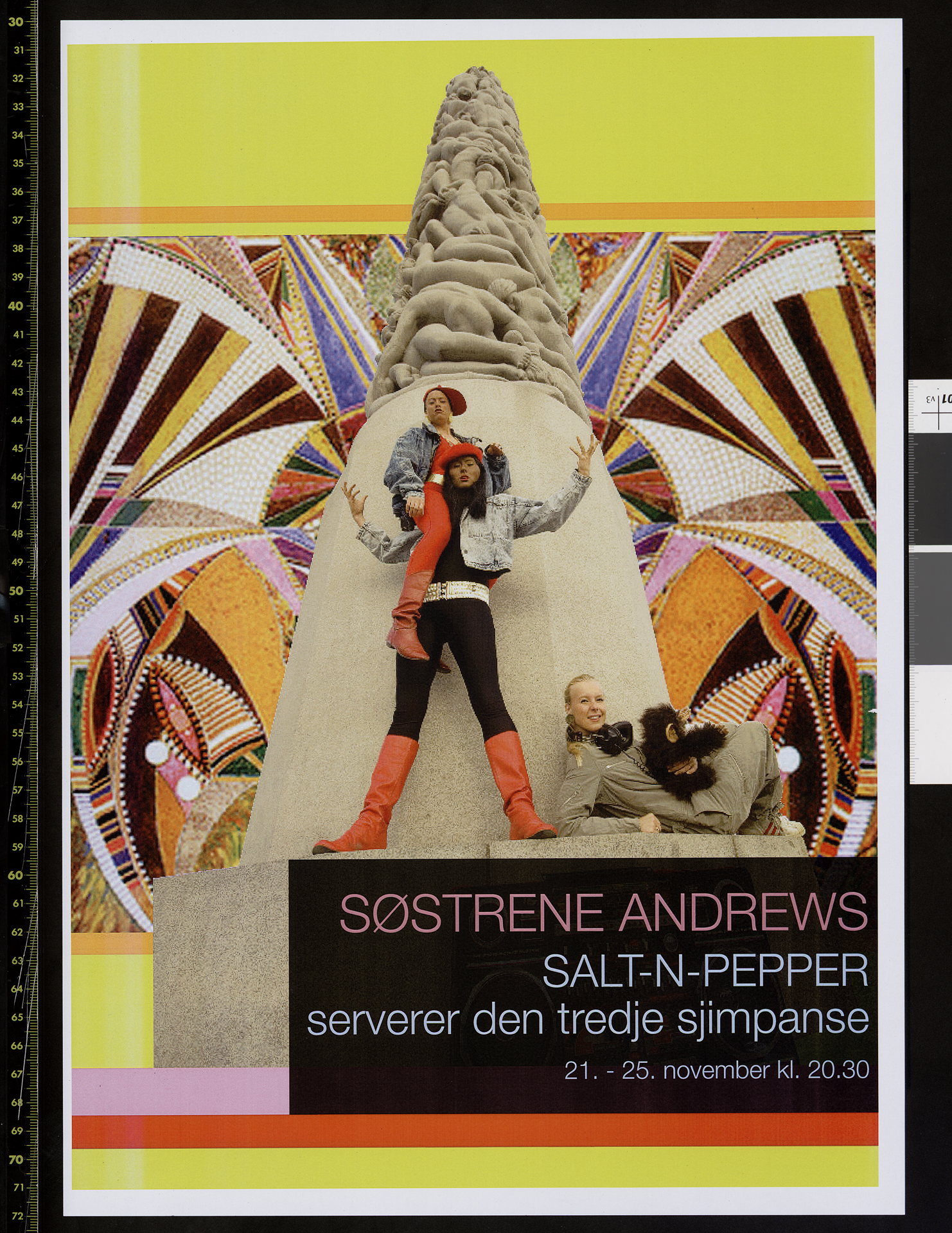 Plakat for Søstrene Andrews' produksjon Salt'N'Pepper serverer den tredje sjimpanse (2009). Plakaten er fra forestillngene på Black Box Teater i Oslo i november 2009.
