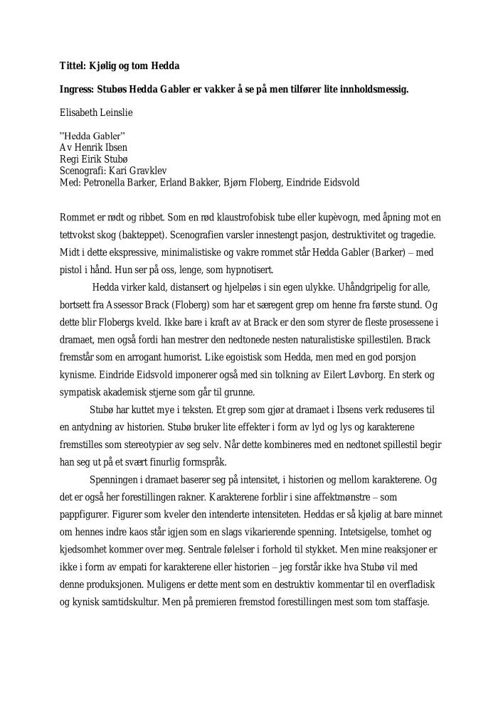 Kjølig og tom Hedda. Anmeldelse av Nationaltheatrets produksjon Hedda Gabler (2006). Anmeldelsen ble publisert i Dagsavisen 28. august 2006.