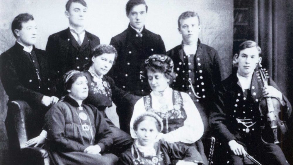 På bilde: Ingebjørg Hektoen, Klara Semb, Anna Semb, Hulda Garborg, Rasmus Breistein, Edvard Drabløs, Aadne Olaus Fjørtof Garborg, Johan Mikkelsen og Olai Breistein