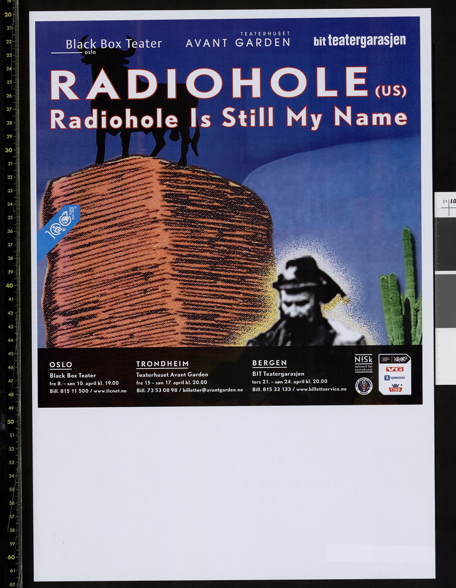 Plakat for Radioholes produksjon Radiohole is still my name. Plakaten er fra forestillingene på Black Box Teater, BIT teatergarasjen og Teaterhuset Avant Garden i april 2005.