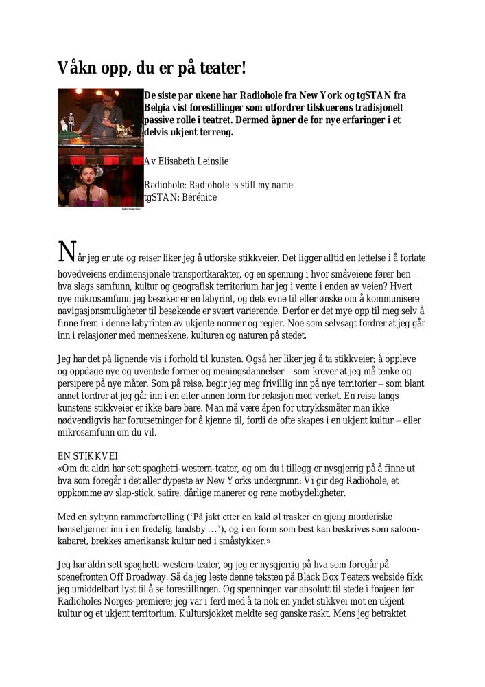 Våkn opp, du er på teater! Anmeldelse av Radioholes produksjon Radiohole is still my name (2005) og tgSTANs produksjon Bérénice (2005). Anmeldelsen ble publisert på Kunstkritikk.no 14. april 2005.