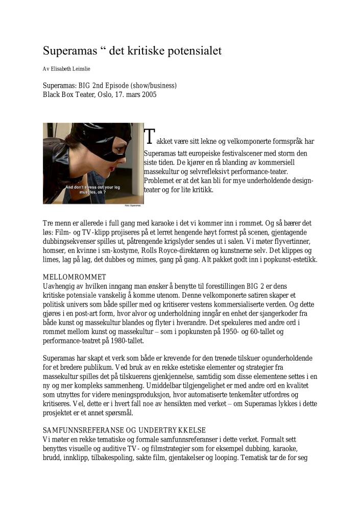 Superamas " det kritiske potensialet. Anmeldelse av Superamas' produksjon BIG 2nd Episode (show/business) (2005). Anmeldelsen ble publisert på Kunstkritikk.no 1. april 2005.