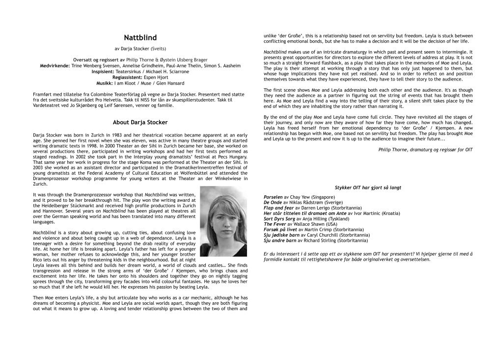 Program for Oslo Internasjonale Teaters produksjon Nattblind (2011)