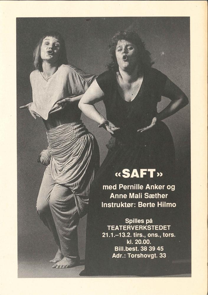 Forestillingsprogram fra Anne Mali Sæther, Pernille Anker og Berte Hilmos produksjon Saft (1990)