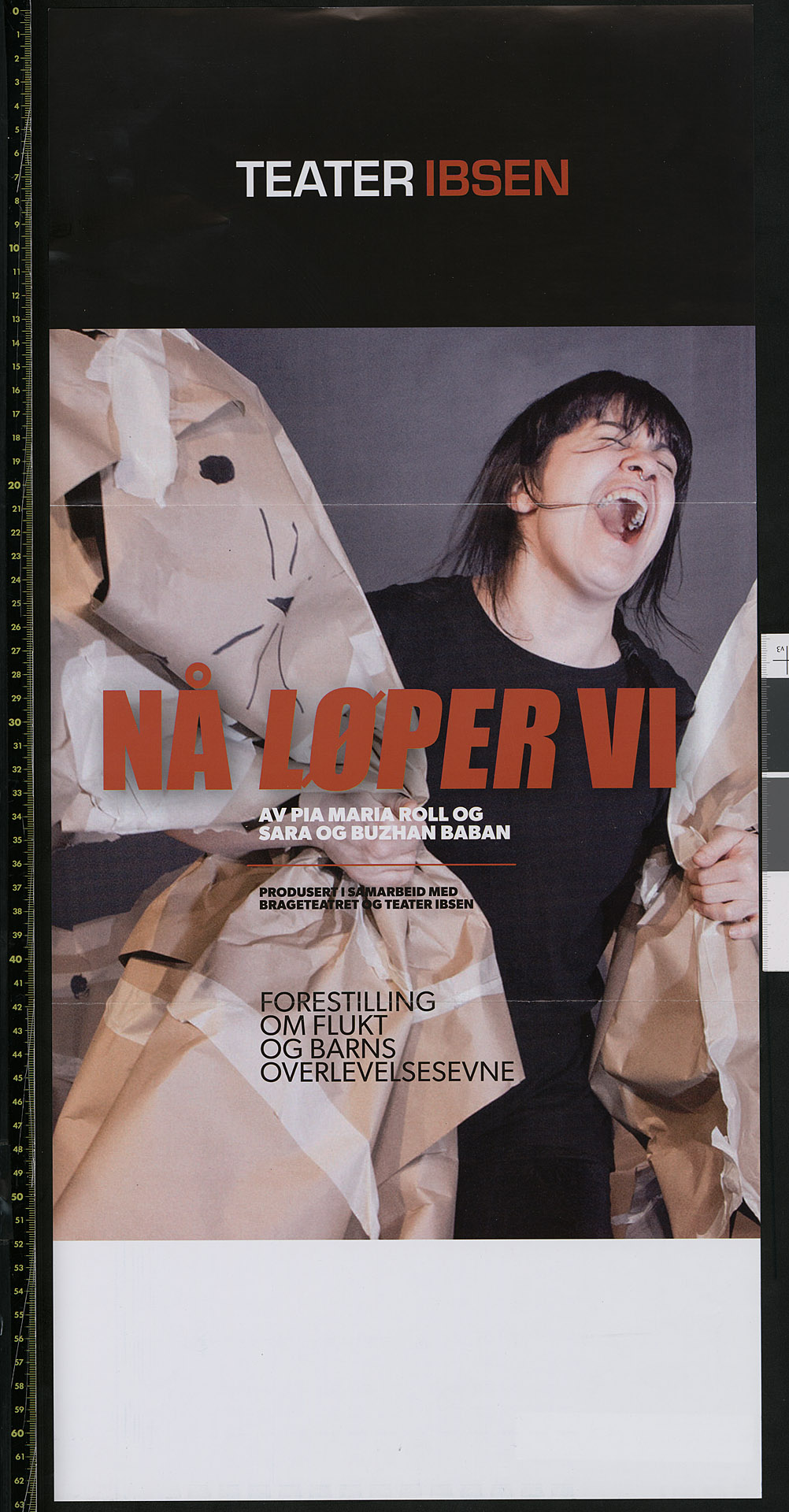 Plakat for Pia Maria Rolls produksjon Nå løper vi (2016). Plakaten er fra forestillingene på Teater Ibsen i februar 2017.