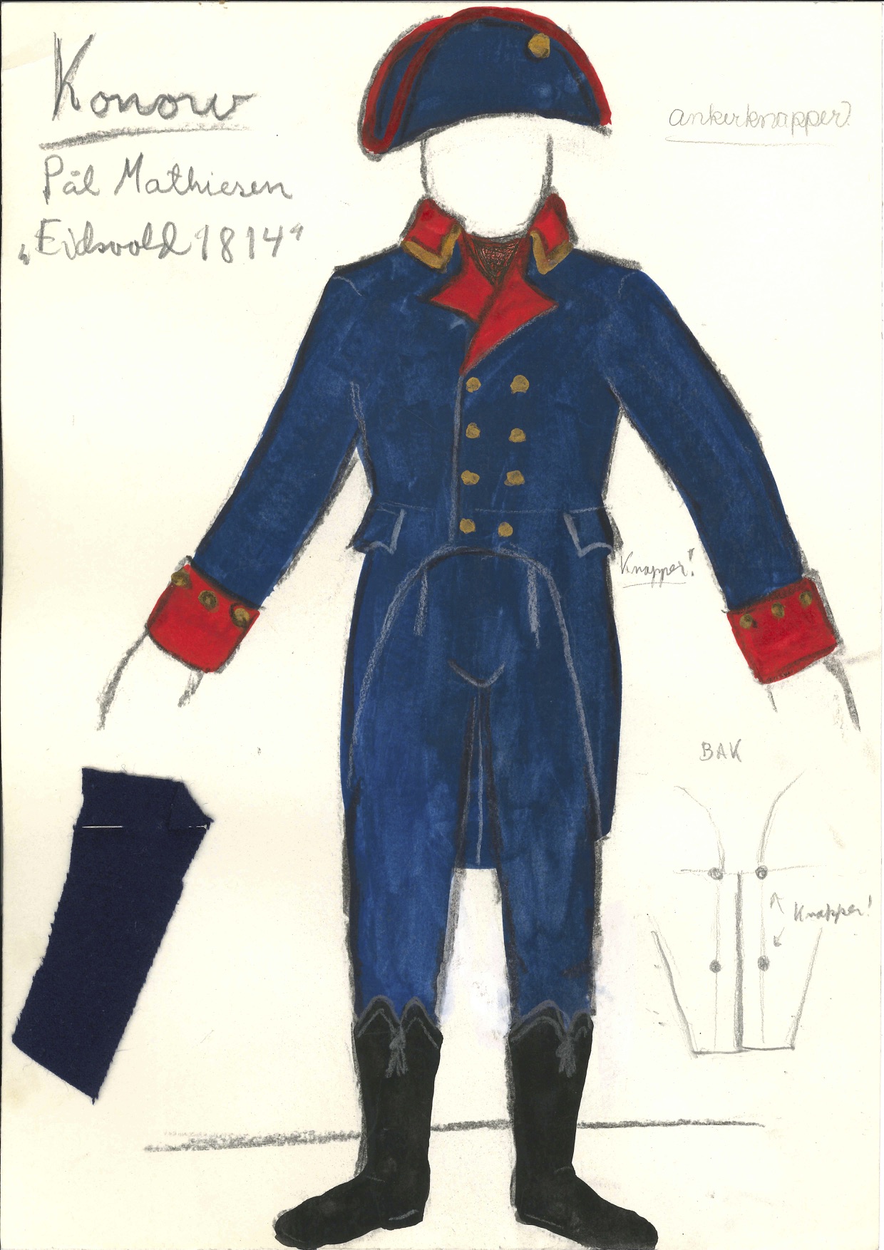 Kostymetegning fra Riksteatrets produksjon Spillet om Eidsvold 1814 (1989).