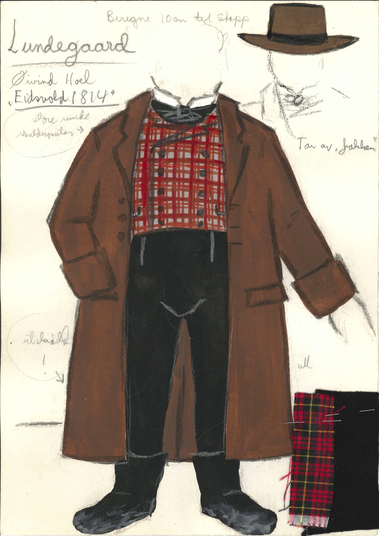 Kostymetegning av Einar Dahl fra Riksteatrets produksjon Spillet om Eidsvold 1814 (1989)