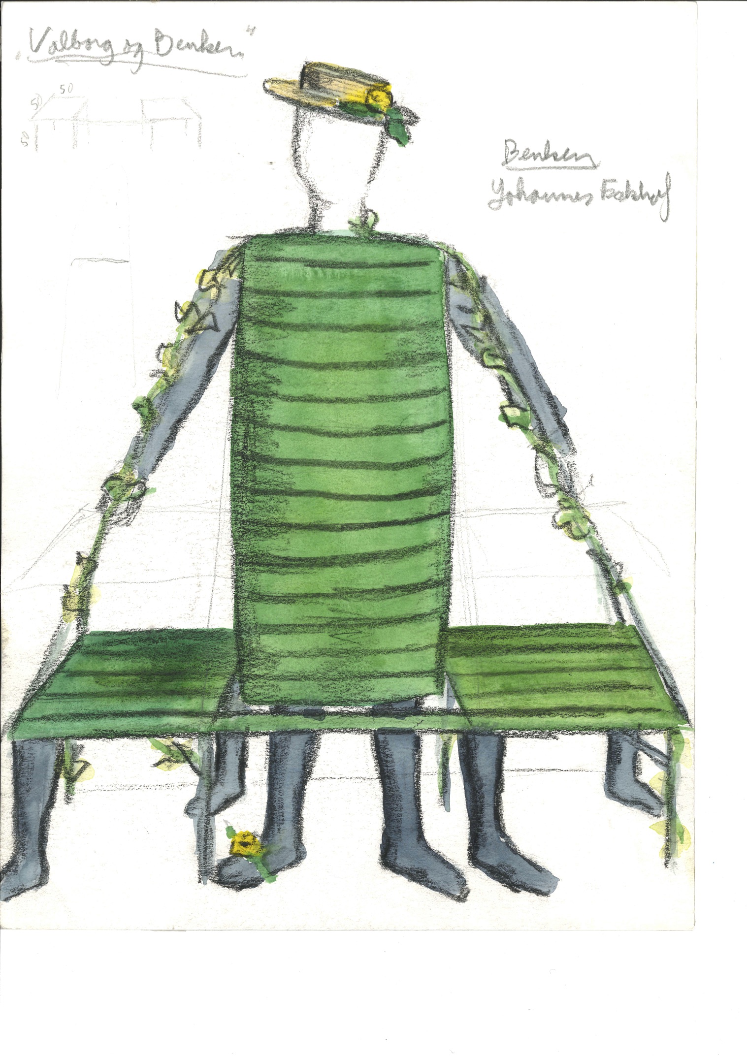Kostymetegning av Einar Dahl fra Riksteatrets produksjon Valborg og benken (1985).