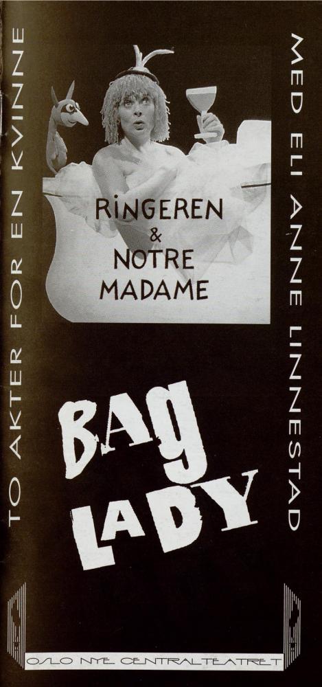 Forestillingsprogram for Oslo Nye Teaters produksjon To aktter for en kvinne - Ringeren & Notre Madame og Bag Lady (1996).