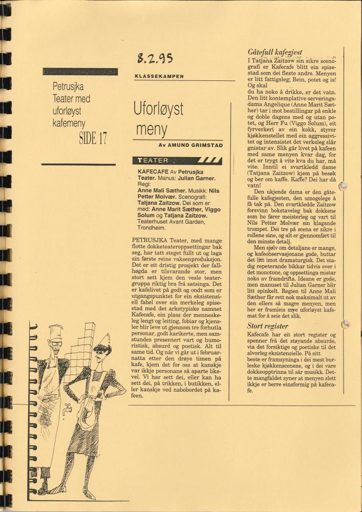 Uforløst meny. Anmeldelse av Petrusjka Teaters produksjon KafeCafe (1995). Anmeldelsen ble publisert i Klassekampen 8. februar 1995.