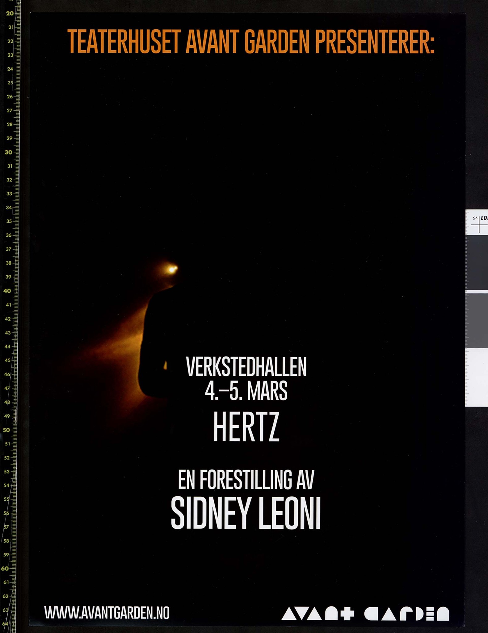 Plakat for Sidney Leonis produksjon Hertz (2013). Plakaten er forestillingene i Teaterhuset Avant Garden 2015