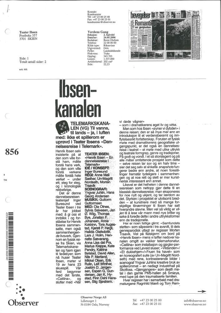Ibsen-kanalen. Anmeldelse av Teater Ibsens produksjon Henrik Ibsen - En dannelsesreise i Telemark (2006). Anmeldelsen ble publisert i Verdens Gang 24. mai 2006.