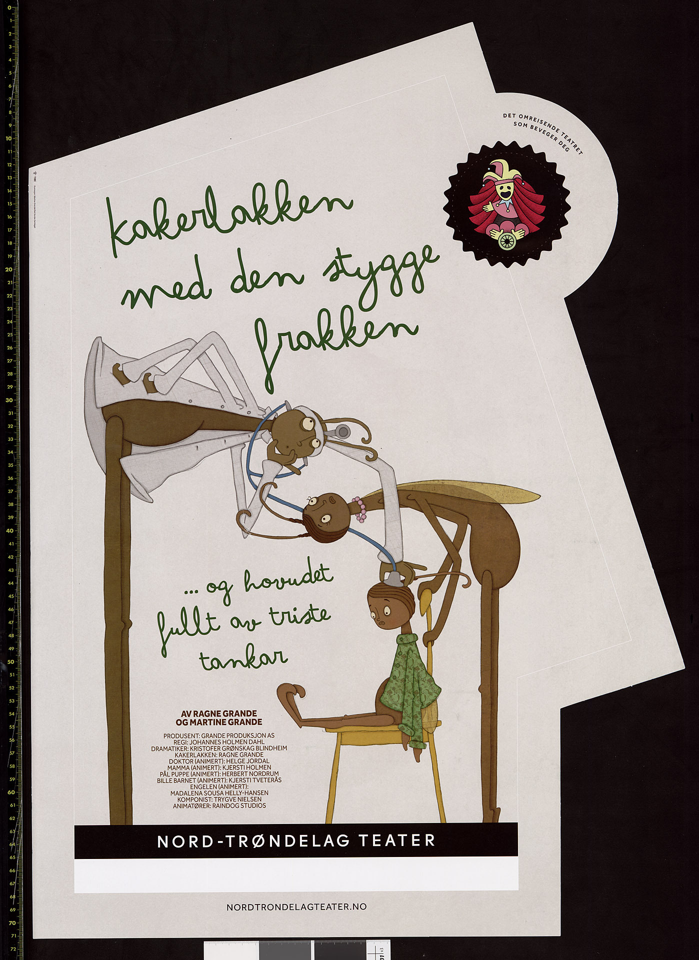 Plakat for Grande Produksjons produksjon Kakerlakken med den stygge frakken (2013). Plakaten er fra turné med Nord-Trøndelag Teater i 2015
