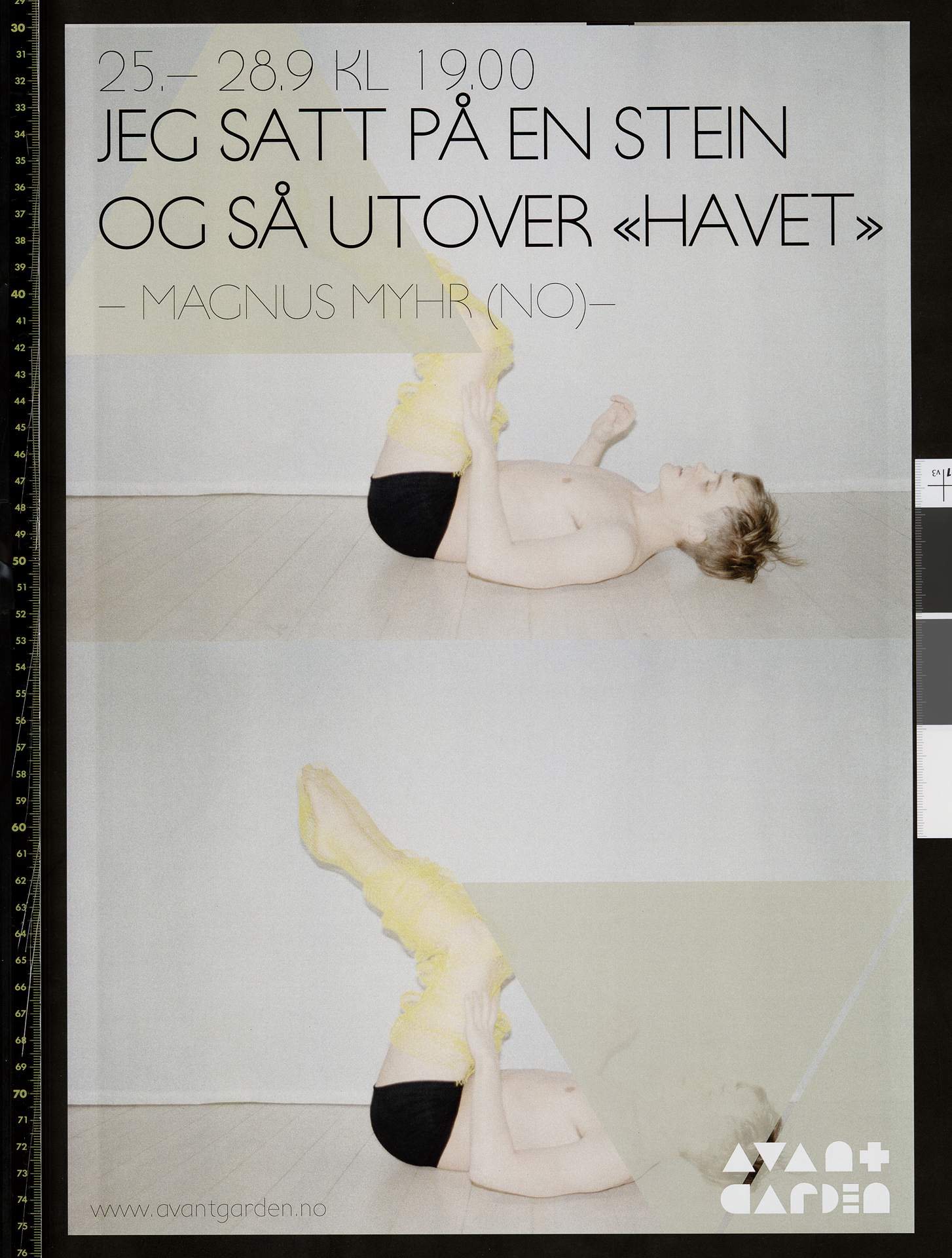Plakat for Magnus Myhrs produksjon Jeg satt på en stein og så utover "havet" (2014). Plakaten er fra forestilling på Teaterhuset Avant Garden 2014