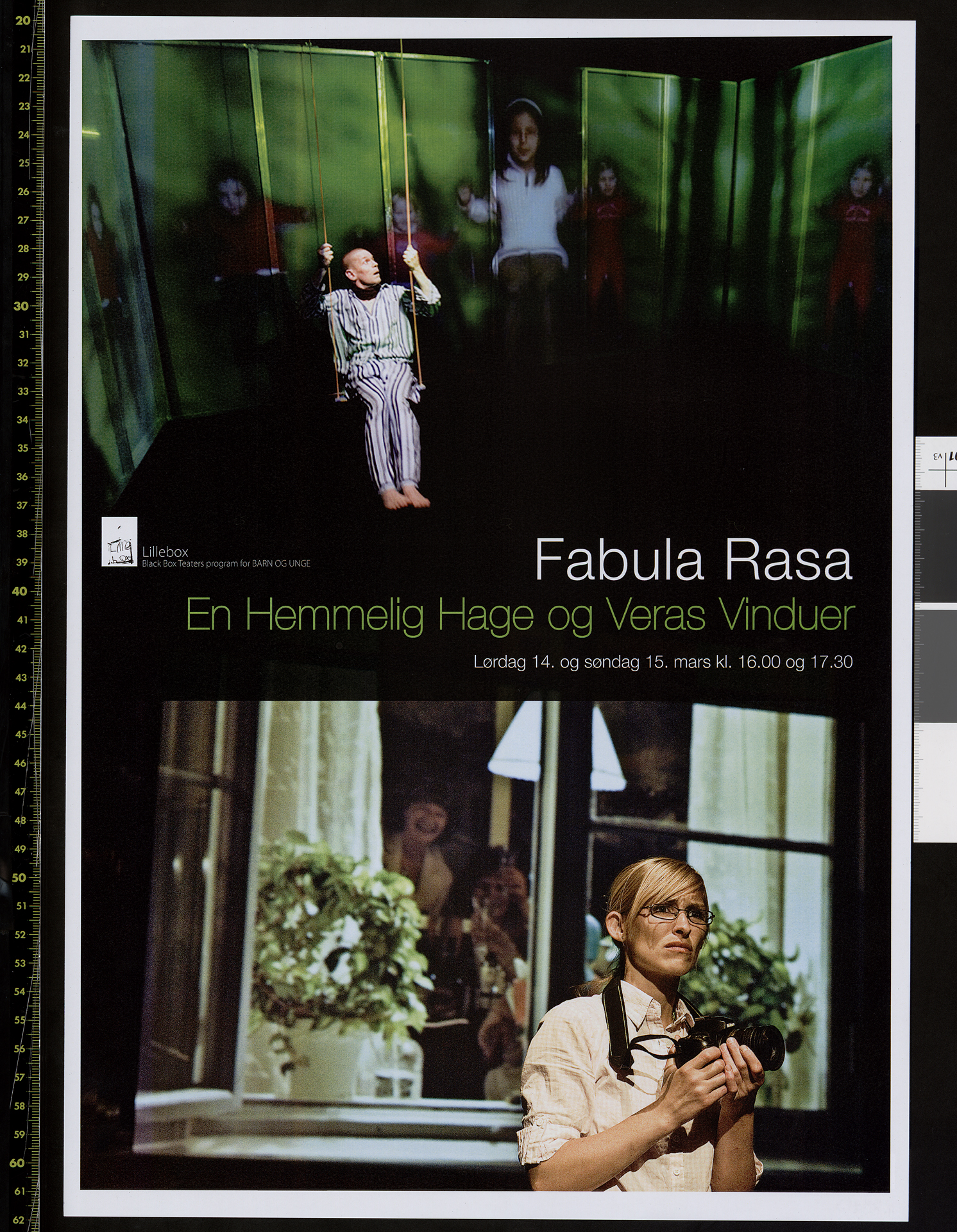 Plakat for Fabula Rasas produksjoner Den hemmelige hagen (2005) og Veras Vinduer (2008). Plakaten er for forestillinger som ble spilt på Black Box Teater i 2009.