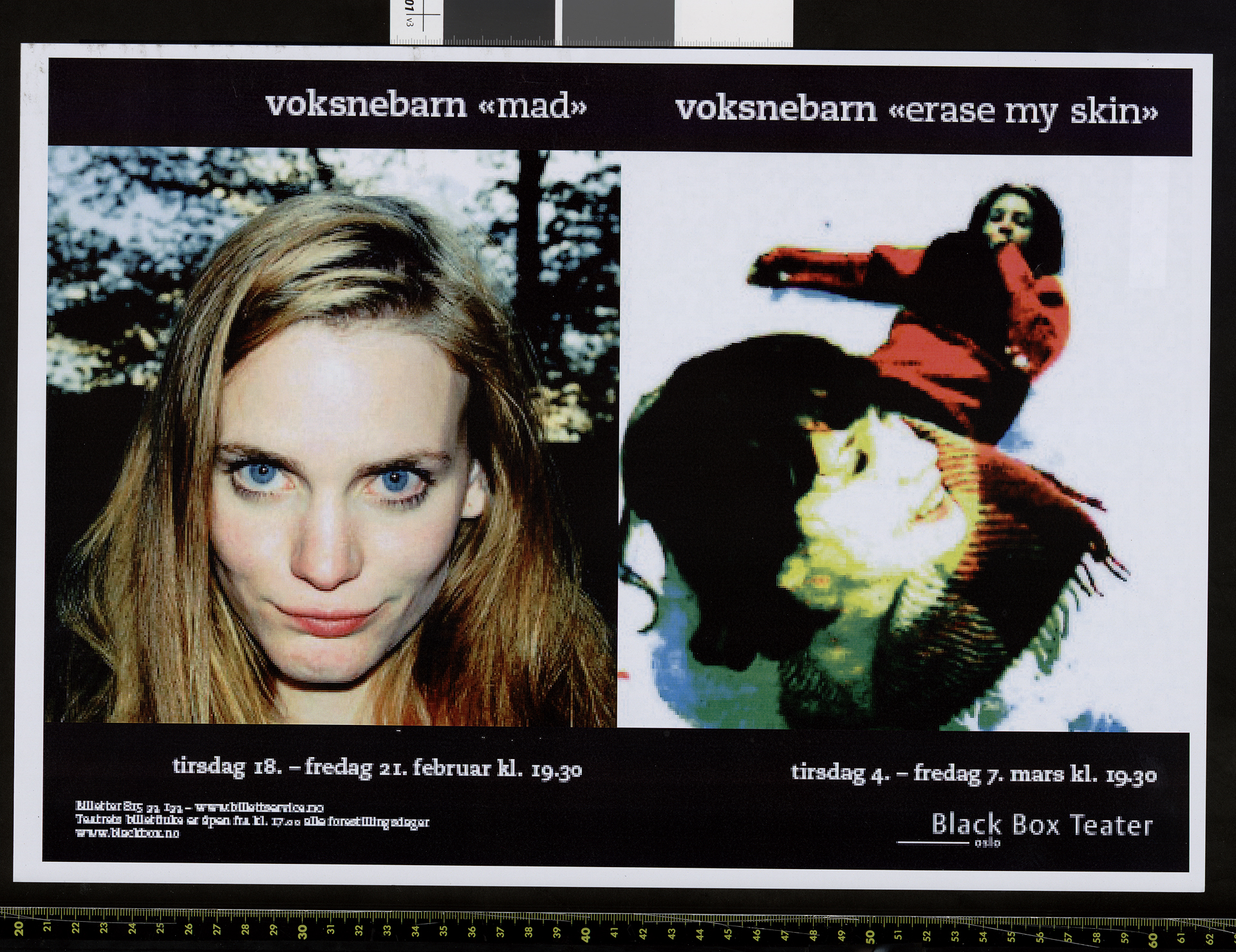Plakat for Voksnebarns produksjon Erase my skin (2003). Plakaten er fra forestillingene på Black Box Teater