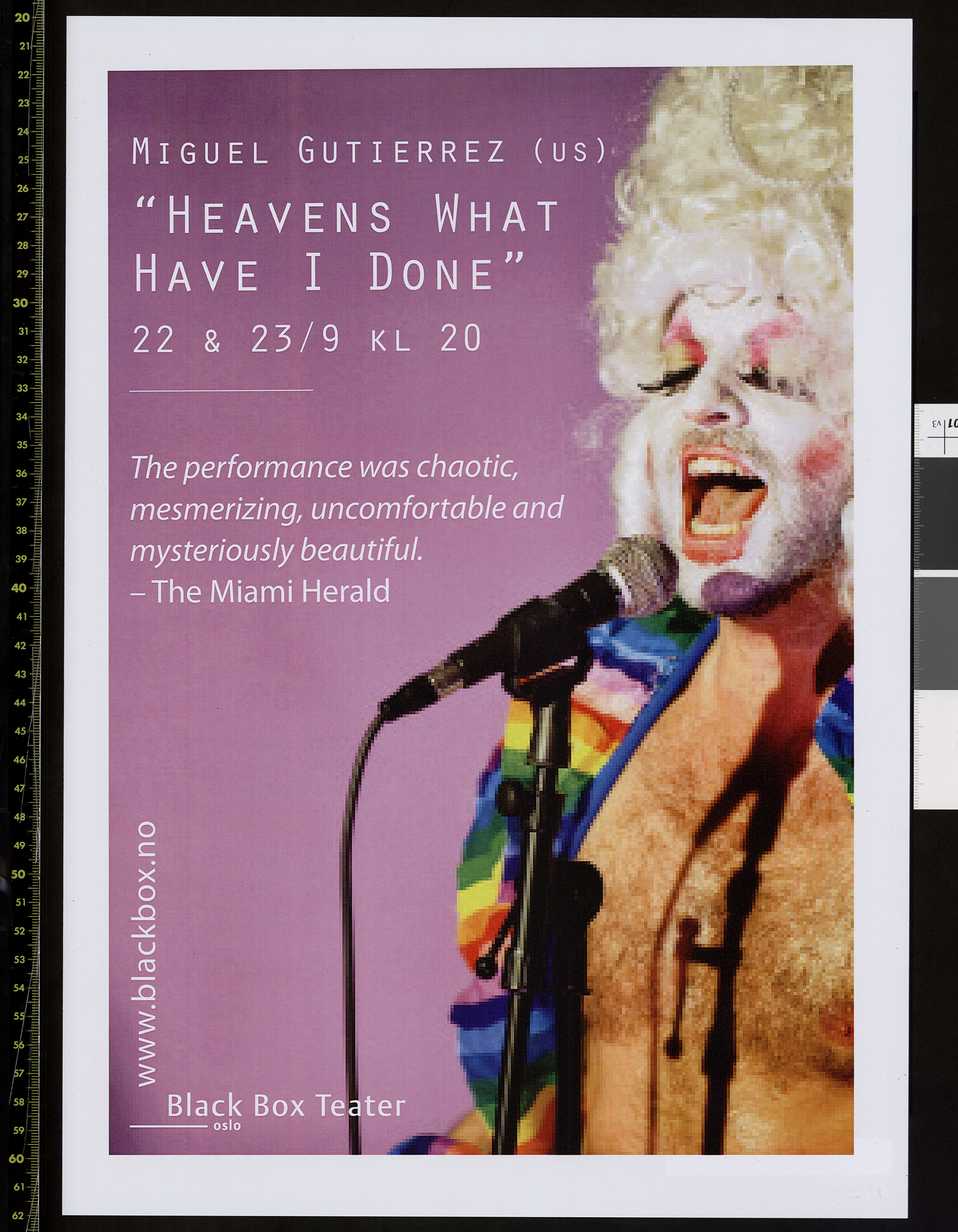 Plakat for Miguel Gutierrezs produksjon Heavens what have I done (2010). Plakaten er fra forestilling på Black Box Teater i 2011.
