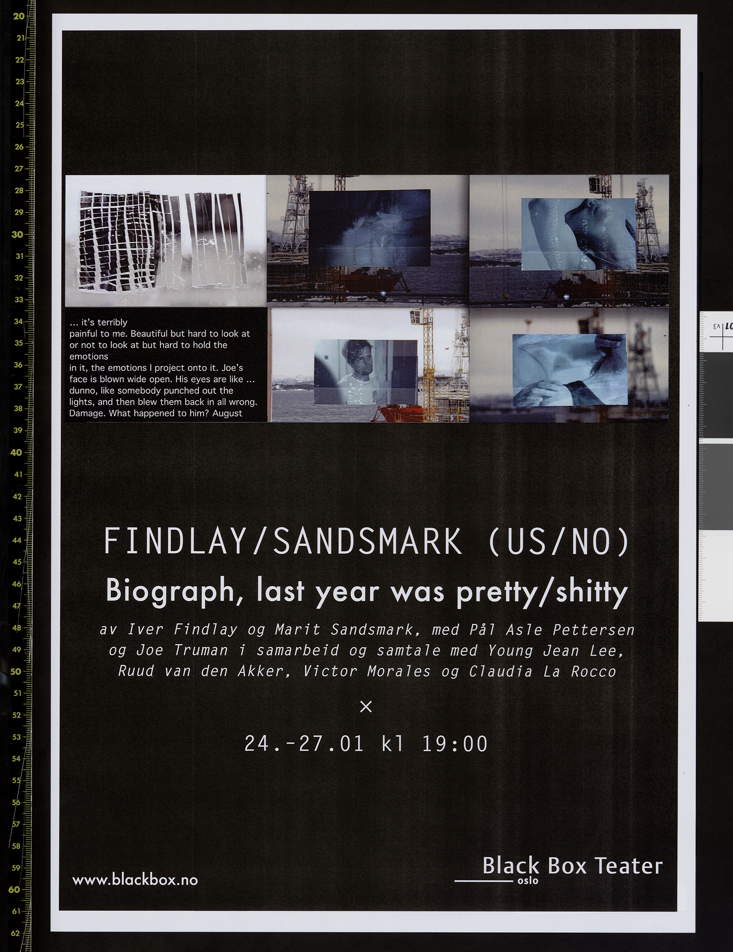 Plakat for Findlay/Sandsmarks produksjon Biograph, last year was pretty/shitty (2013). Plakaten er fra forestillingene på Black Box Tetaer 2013.