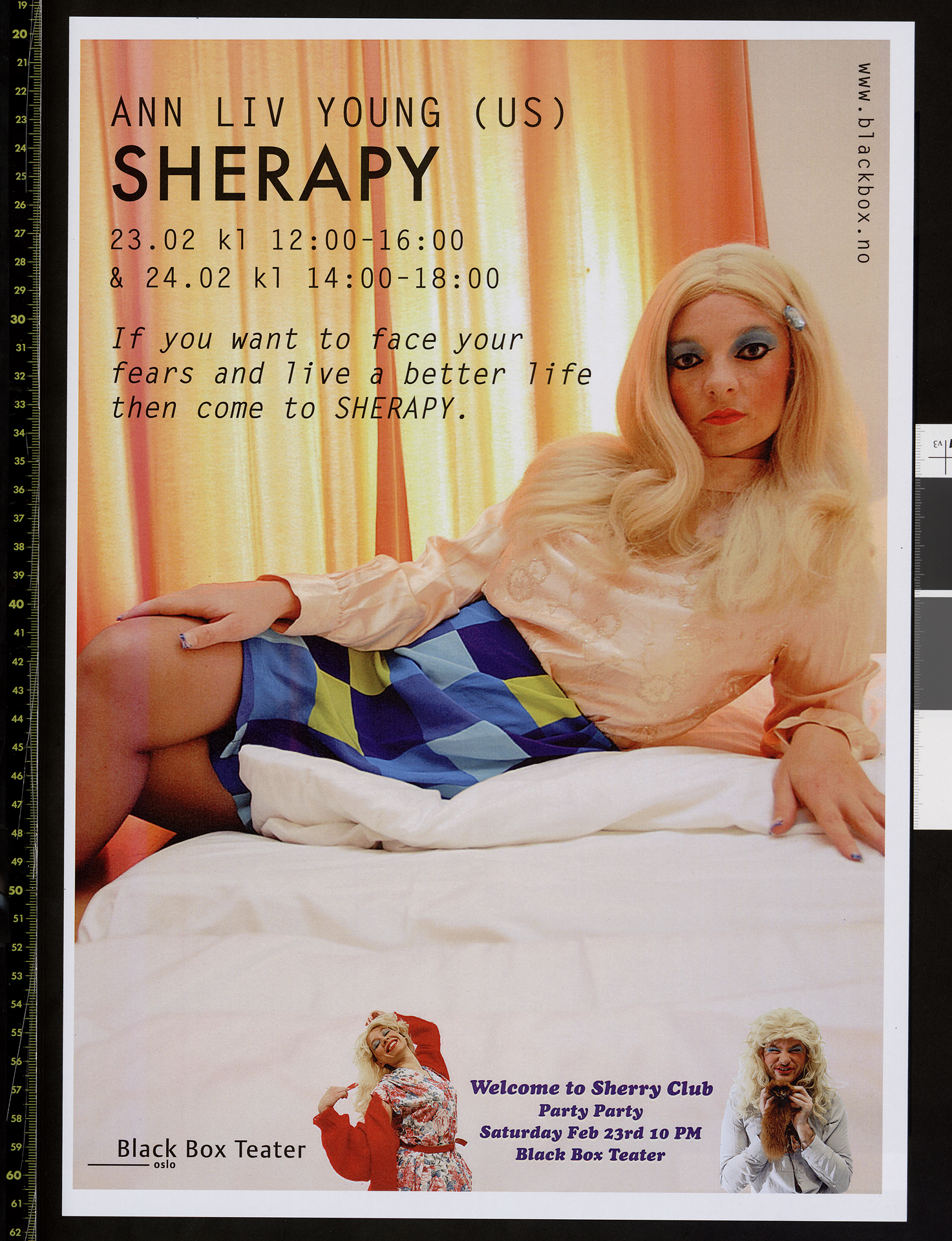 Plakat for Ann Liv Youngs produksjon Sherapy. Plakaten er fra forestillingen på Black Box Teater i 2013.