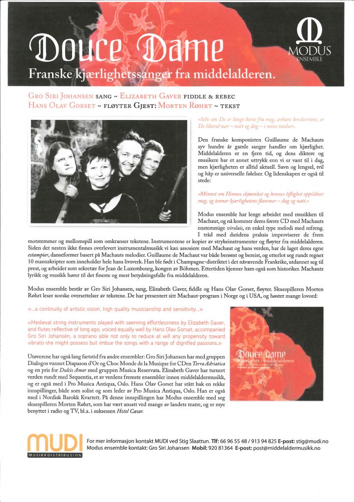 Pressemelding for Modus ensembles produksjon Douce Dame (2003).