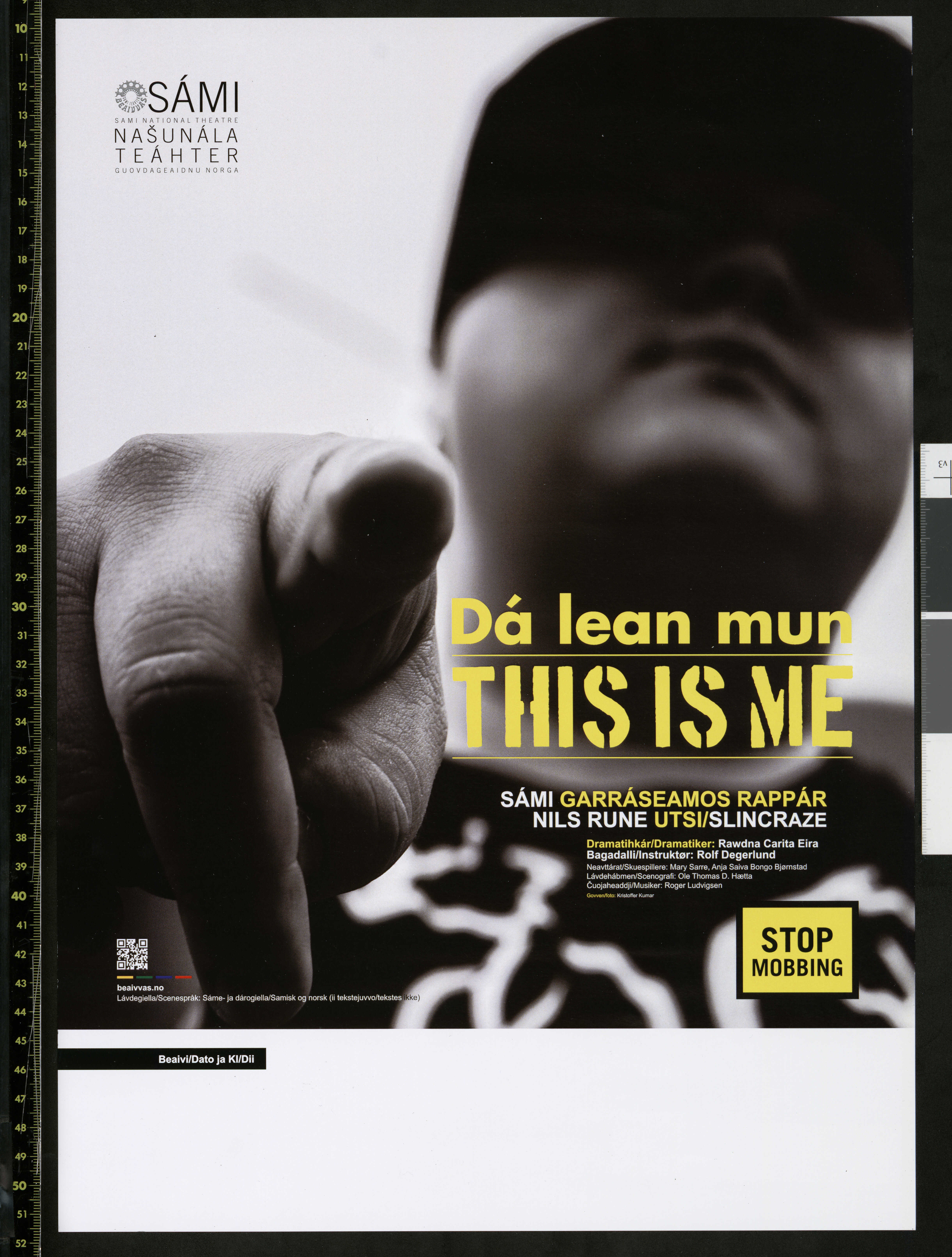 Forestillingsplakat for Beaivváš Sámi Našunálateáhters produksjon "Dà lean mun / This is me" (2017).