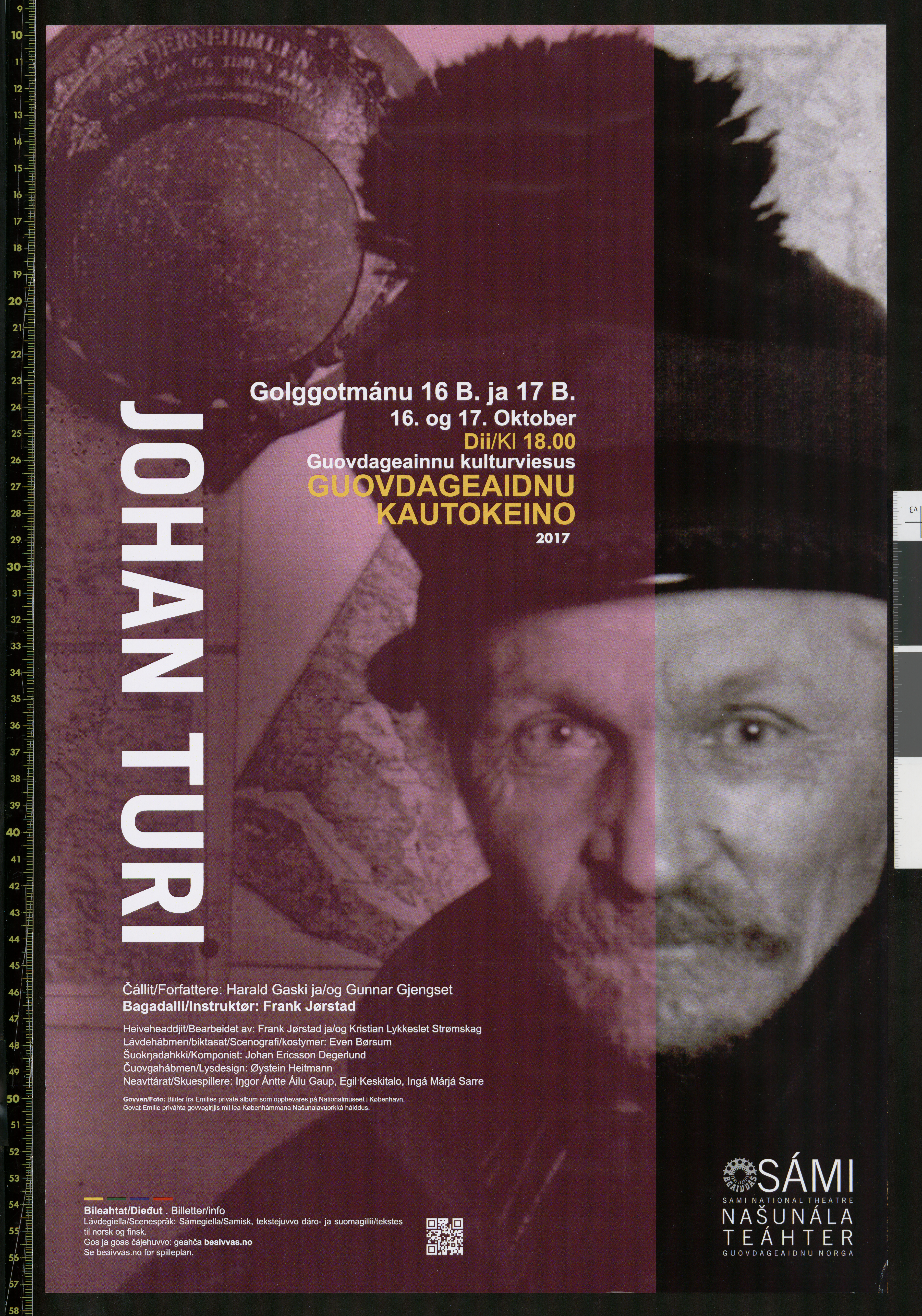 Forestillingsplakat for Beaivváš Sámi Našunálateáhters produksjon "Johan Turi" (2017). Plakaten er fra forestilllingen på Kautokeeino, Beaivváš Sámi Našunálateáhter