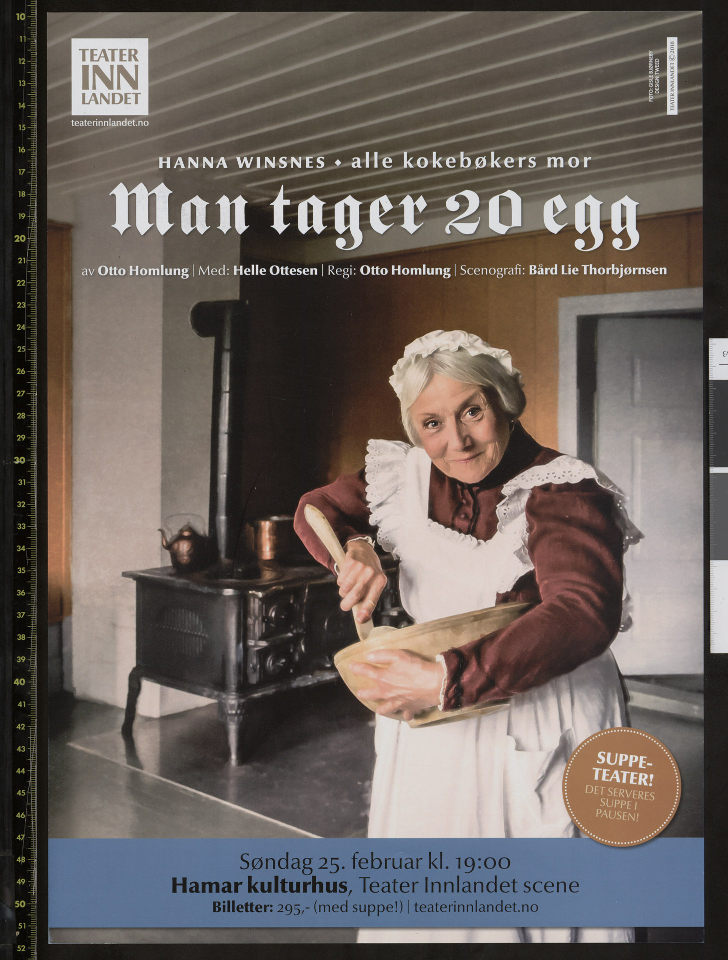Plakat for Teater Innlandets produksjon "Man tager 20 egg" (2018).
