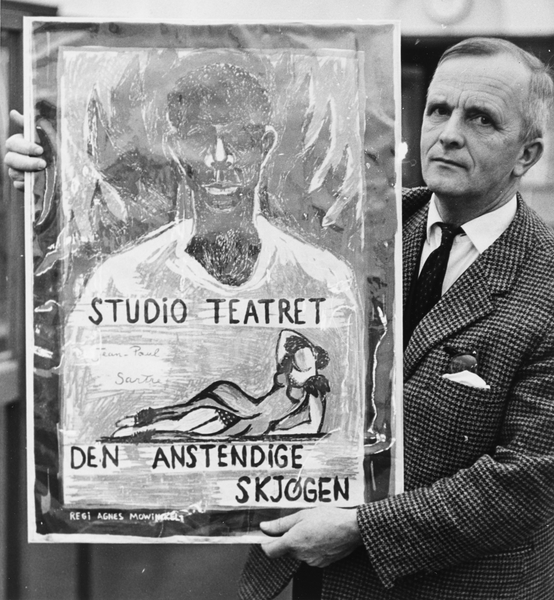 Fotografi av plakat fra Studioteatrets produksjon Den anstendige skjøgen (1947).