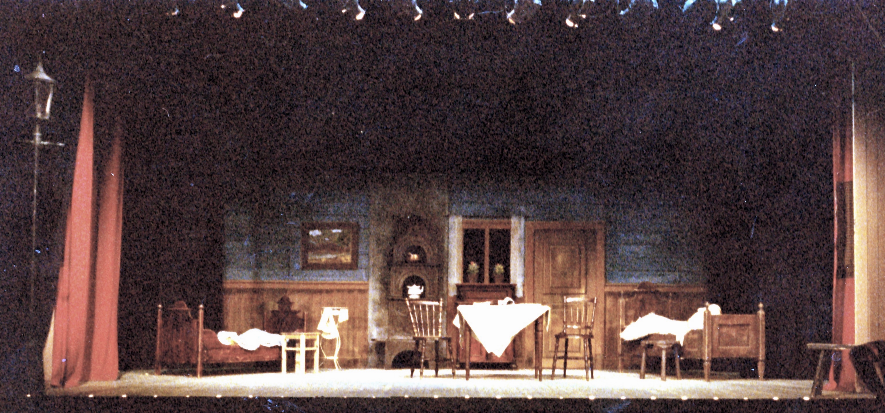 Fotografi av scenografien til scenene hjemme hos Hønse Lovisa i Riksteatrets produksjon Ungen (1980)