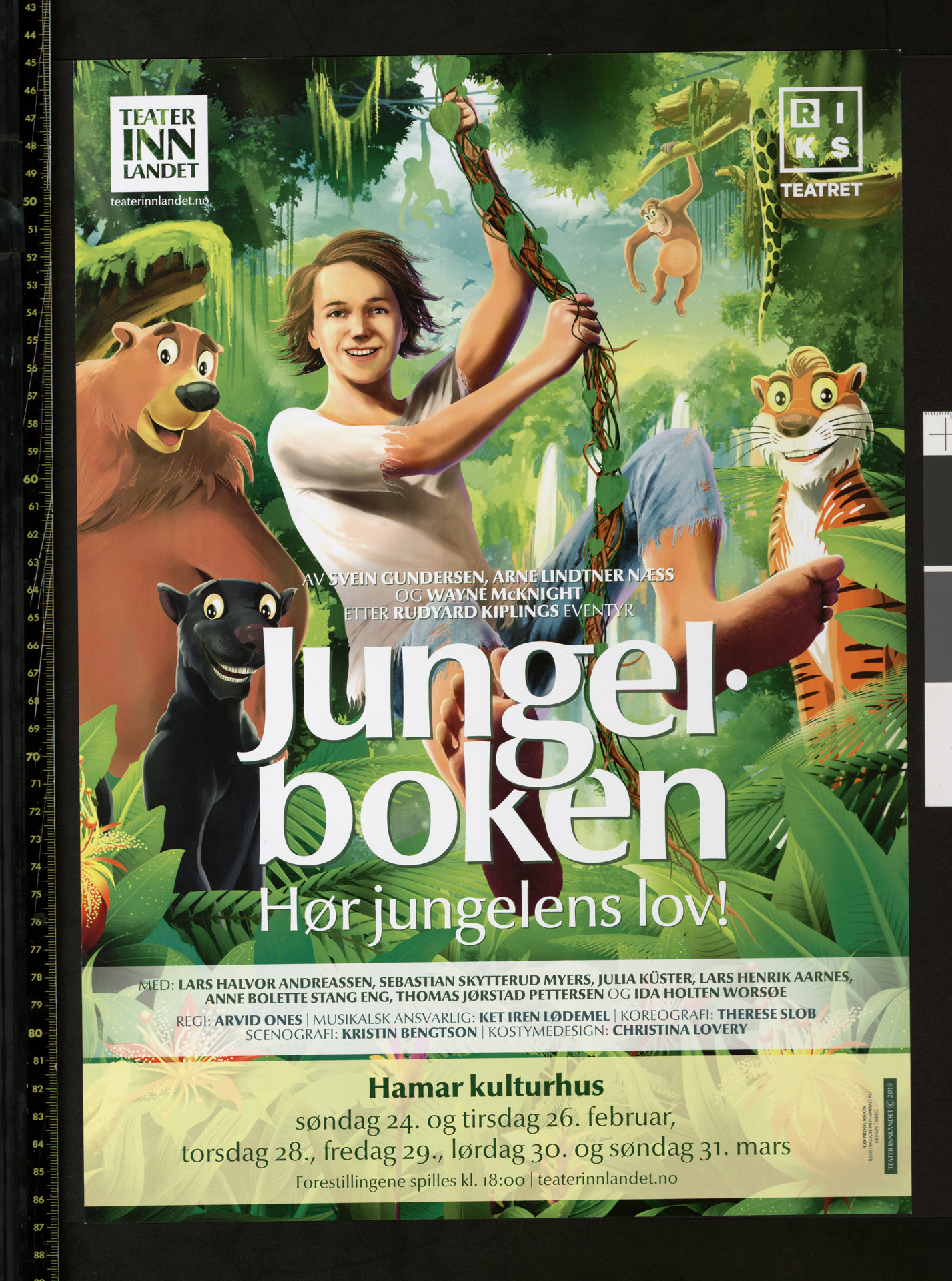 Plakat for Teater Innlandet og Riksteatrets produksjon Jungelboken (2019). Plakaten er fra forestillingene i Hamar kulturhus 24.-31. mars 2019.