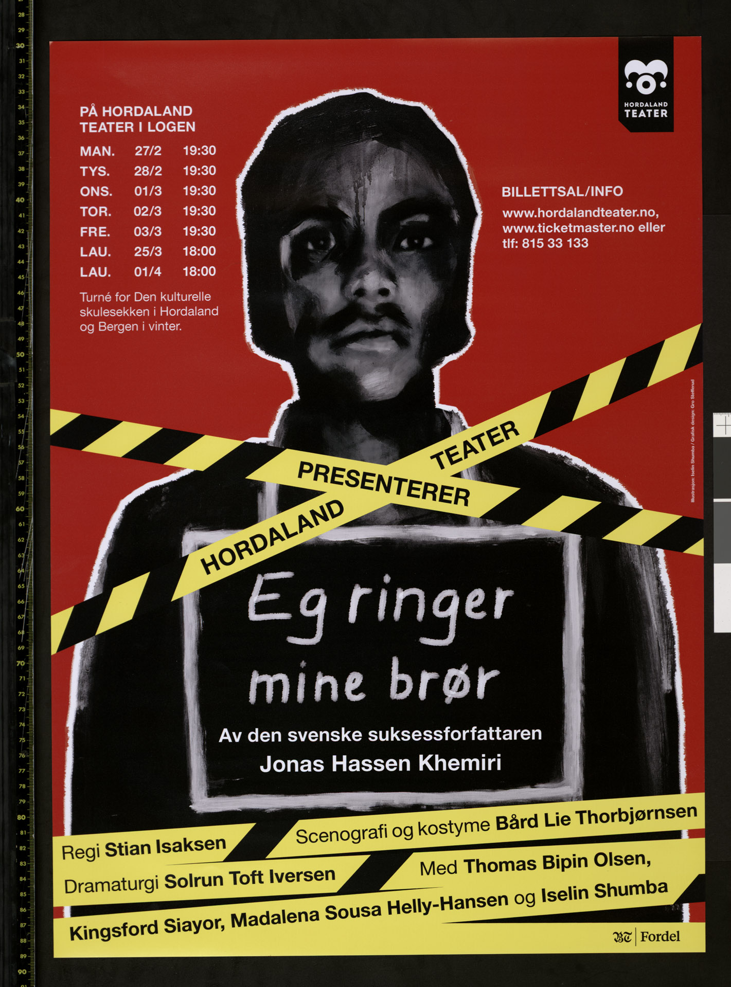 Plakat for Hordaland Teaters produksjon Eg ringer mine brør (2017). Plakaten er fra forestillingene i Logen 27. februar - 1. april 2017.