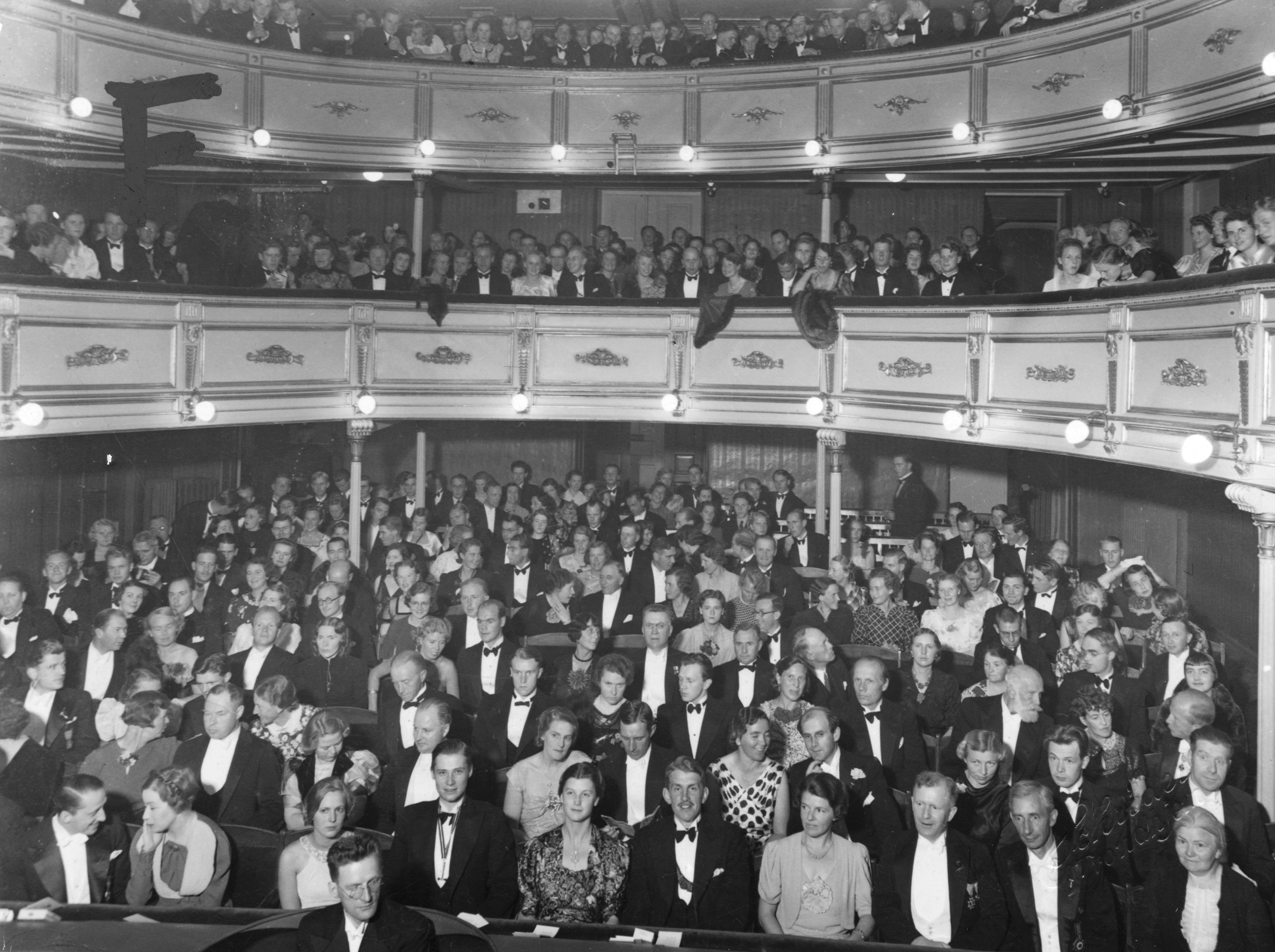Fotografi av amfi, balkongrader og losjer i den gamle teatersalen.