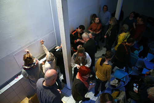 På bildet: Publikum skriver seg inn