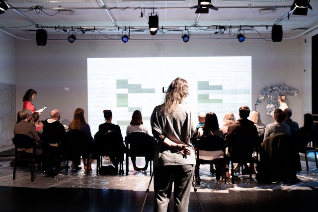 Fotografi fra Ferske Sceners produksjon Talking in the Rain (2019). Fotografiet er fra publikumsmøte hos Dansearena Nord 10. april 2019.