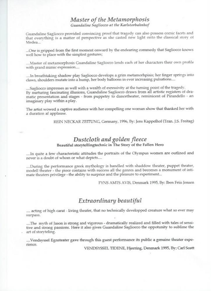 Utdrag fra 1 tysk og 2 danske anmeldelser av Sagliocoo Ensemble og Inside the Images produksjon Historien om den falne helt (1993). Publikasjonssteder: Fyns Amts Avis, Vendsyssel Tidene, Rein Necka Zeitung. Danske i 1995, tysk i 1996