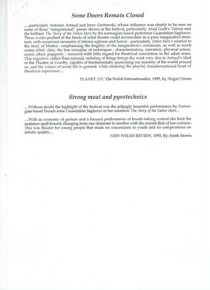 Utdrag fra 2 walisiske anmeldelser av Sagliocoo Ensemble og Inside the Images produksjon Historien om den falne helt (1993). Publikasjonssteder: The Welsh Internationalist og New Wesh Review. Begge i 1995